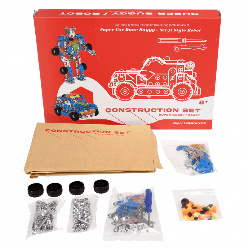 This construction kit contains everything you need to make either a super car dune buggy or a sci-fi style robot. What will you build?