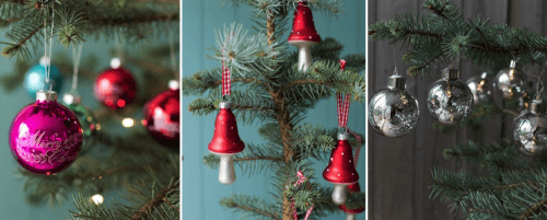 Pictured: Set of 12 Christmas baubles - £19.95 (left), Set of 6 glass toadstool decorations - £7.95 (centre), 10 Large antique style silver LED baubles - £18.95 (right)