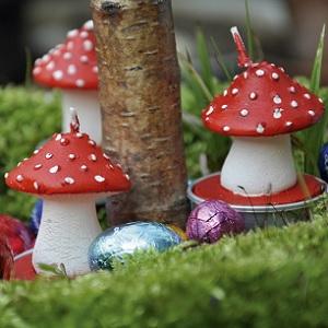 These toadstool t-lights will look great inside and outside, and the songbird nesting boxes are perfect for holding tiny chocolate treats.