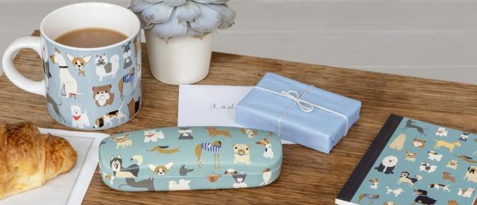 A mug, glasses case and notebook with a dog print, and an envelope with 'Dad' written on it