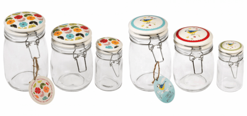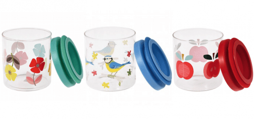 Pictured: Mid Century Poppy Glass Storage Jar - £6.95 (left) Blue Tit Glass Storage Jar - £6.95 (centre), Vintage Apple Glass Storage Jar - £6.95 (right)