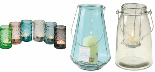 Pictured: Set of 6 Coloured Glass Tealight Holders - £14.95 (left), Large Geometric Blue Candle Holder - £19.95 (centre), Green Mason Jar Tealight Holder - £8.95 (right)