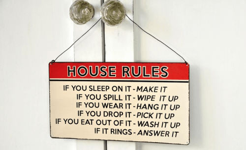When people need to be kept in line or reminded whose boss, namely the woman of the house, these rules should just about cover everything. From dropping food in the kitchen to hanging up your clothes, these light hearted daily instructions will be a subtle reminder to all.