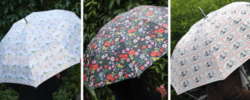 Pictured: Blue tit design ladies umbrella, Midnight garden design ladies umbrella, Bicycle riders favourite design umbrella - all £14.95