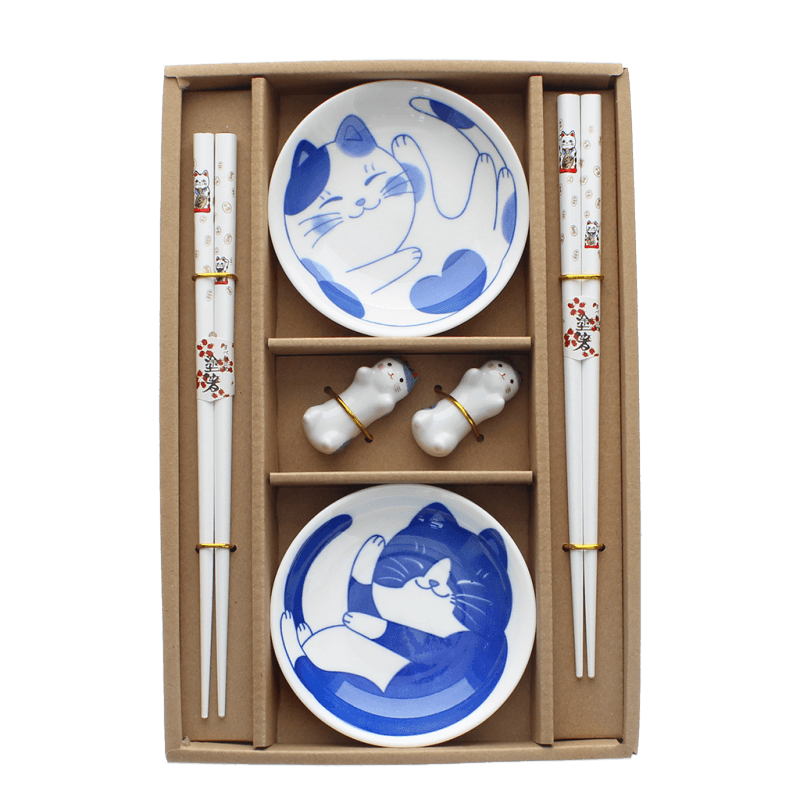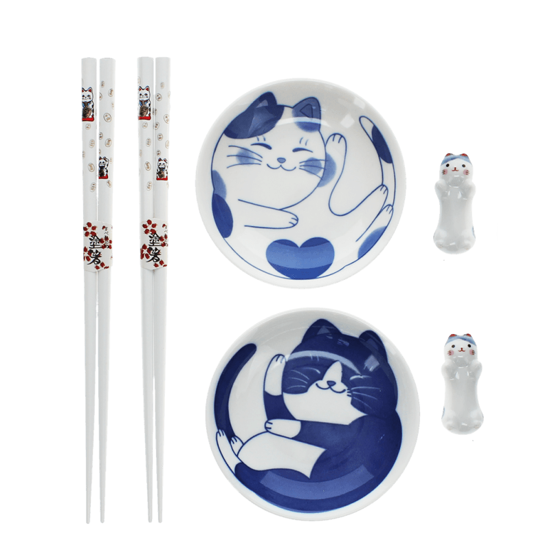 Chopsticks, rests and dipping bowls set - Cat