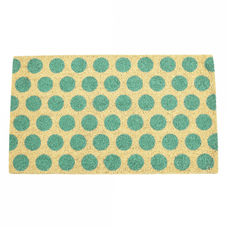 Fußmatte aus Kokosfaser, bedruckt mit unserem Spotlight - Design mit türkisfarbenen Punkten auf naturfarbenem Hintergrund und mit einer rutschfesten Gummibeschichtung auf der Unterseite.