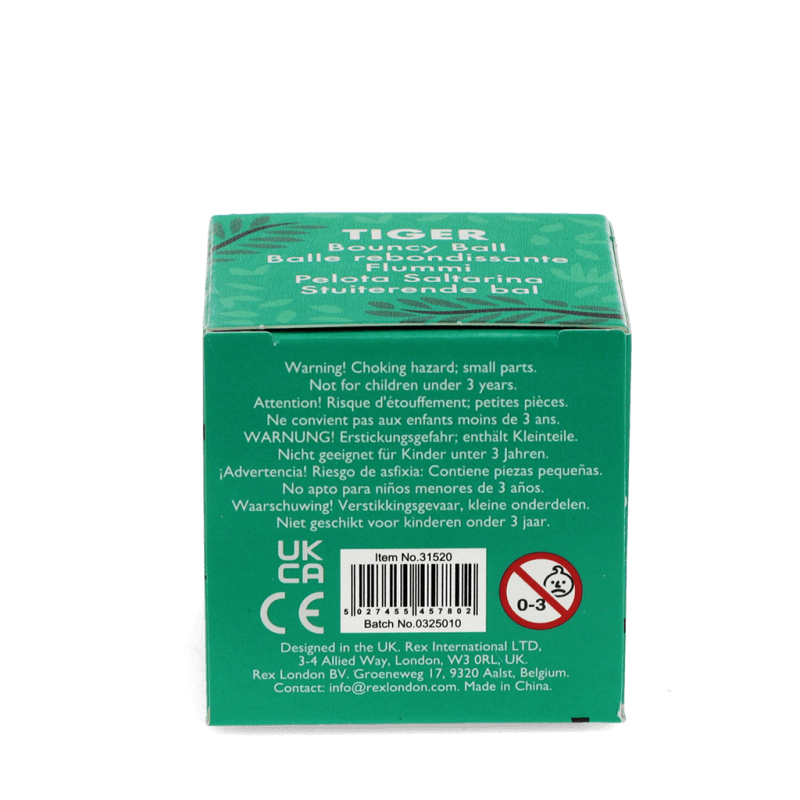 Lustiger, super-hüpfender Flummiball aus Gummi, in Grün mit freundlichem Tigermotiv.