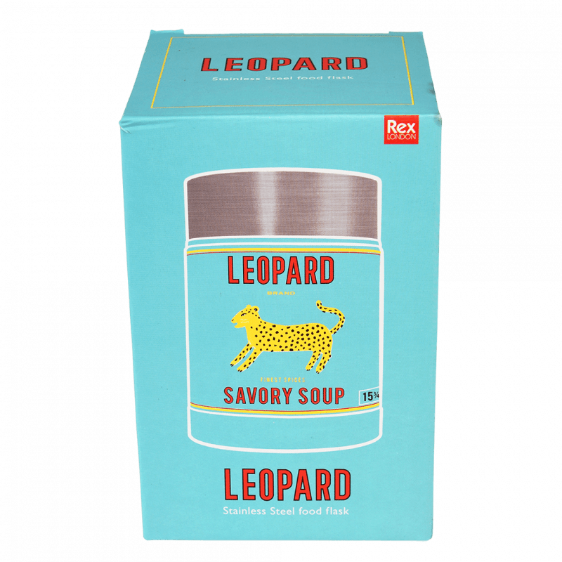 Thermosflasche mit großer Öffnung, dekoriert mit Leopard Savory Soup-Branding, inspiriert von Vintage-Lebensmittelverpackungen.