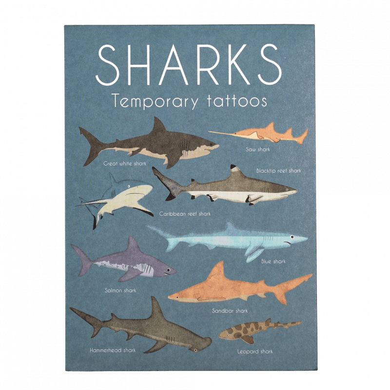 Zwei Bögen mit witzigen, abwaschbaren Tattoos mit exklusive Haifischmotiven, perfekt für Party-Bags, Nikolausstiefel, Adventskalender oder einfach als nettes Mitbringsel.