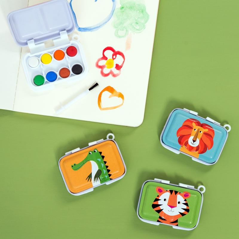 Our Colourful Creatures mini paint set includes eight different watercolour paints and a brush. These charming little pocket paint kits come in three different designs.