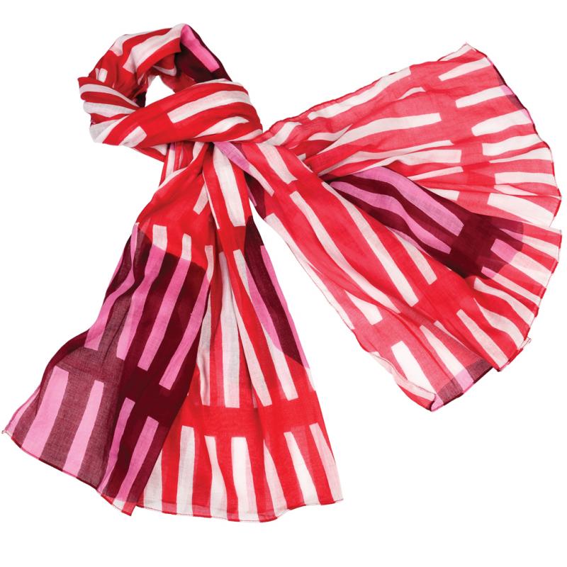 A 100% cotton scarf with reddish hues. An stylish summer outfit accessory.
