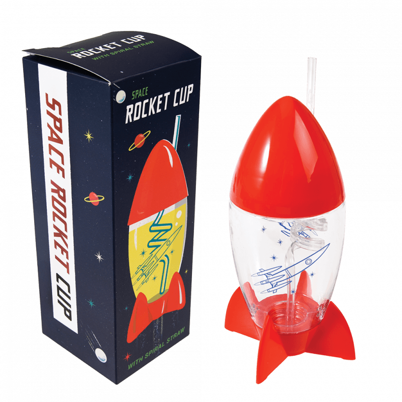 A unique gift for any child who loves space, this Space Age water bottle is shaped like a rocket, and features a spiral straw.