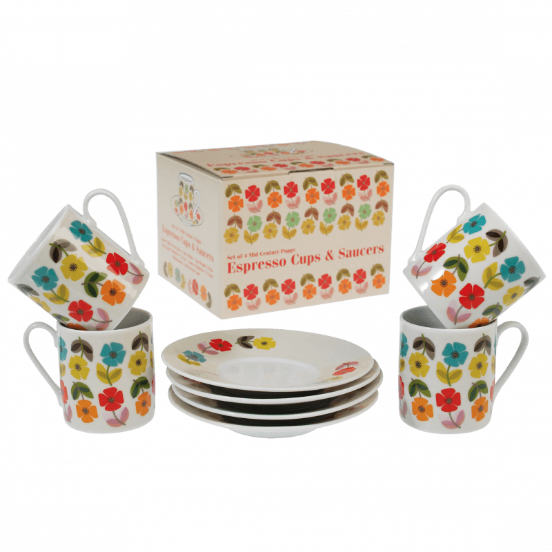 4 TASSES À ESPRESSO ET SOUCOUPES "MID-CENTURY POPPY"