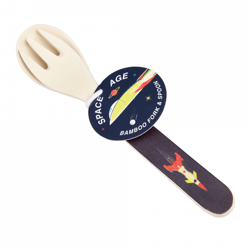 Cet ensemble de couverts pour enfants présente notre design populaire Space Age et est fabriqué à partir de fibre de bambou solide.