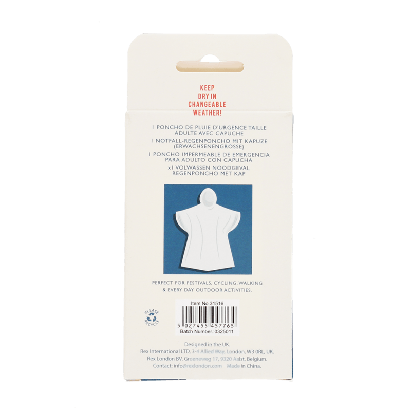 - Fabriqué en polyéthylène (PE), recyclable sous certaines conditions. Renseignez-vous auprès des autorités locales pour savoir si ce poncho est recyclable et où le remettre.