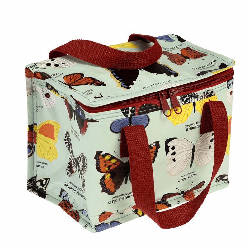 Un sac à lunch isotherme, décoré d'un imprimé de papillons.