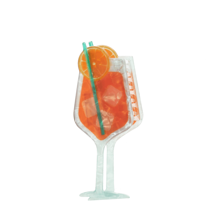 Hair claw clip featuring a zesty Aperitivo Spritz cocktail design, with hints of marbling and translucence. It has a sturdy spring hinge and grippy comb teeth suitable for holding all hair types. The ideal accessory for those who want to add a touch of summer charm and fun to their hairstyle – and keep it securely in place. Made from recycled materials Packaging: Printed card swing tag attached with string