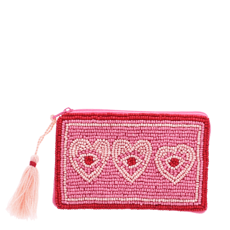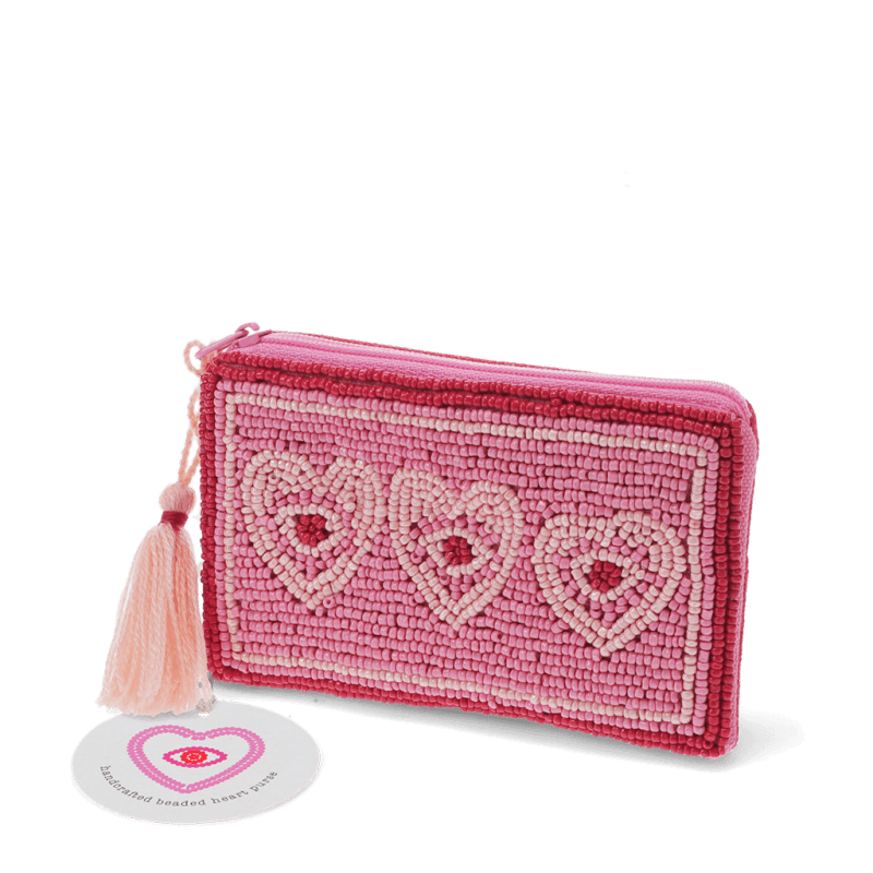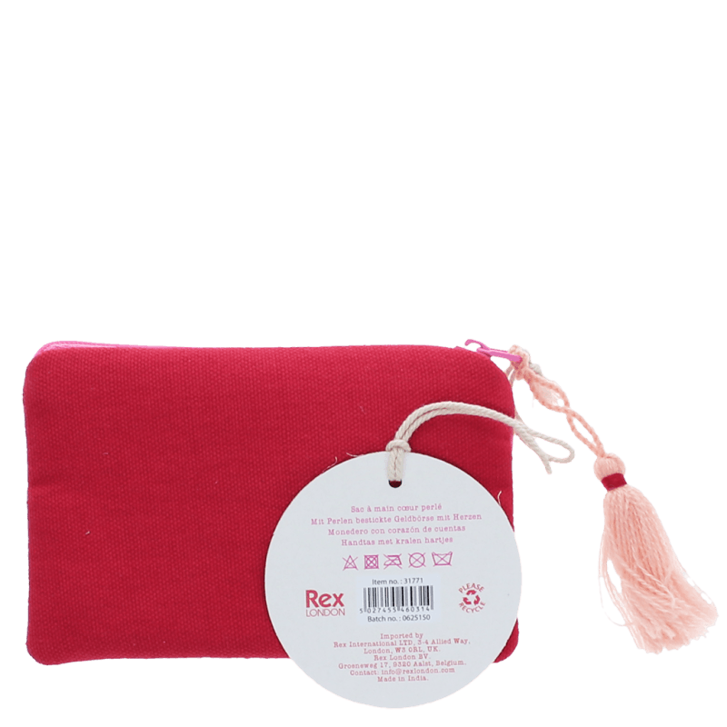 A handy little coin purse with plenty of personality. Handcrafted in pink cotton with a beaded heart design on the front, it features a zip fastening with tassel detail. Perfect for keeping coins, cards, and small essentials in one place.