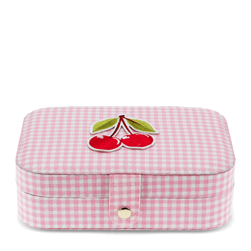 Add some chic style to your bedside table with this charming gingham jewellery box, featuring a cherry motif. Inside is a flock-lined, partitioned interior, perfect for keeping treasured jewellery safe and organised. Compact and portable, it works beautifully as a stylish travel case as well as everyday storage.