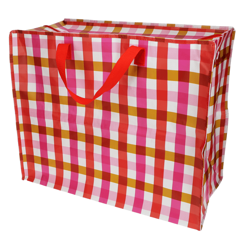 Another addition to our ever-expanding collection of jumbo storage bags, featuring a multi‑coloured gingham pattern combining shades of pink, yellow, red and white. Ideal for moving house, laundry or storing bedding, clothes, toys, etc. Features zip fastening and two strong woven nylon handles in pink Folds flat for easy storage when not in use Made from up to 90% recycled plastic (equivalent to 14 average sized plastic bottles) Approximate volume: 78 litres