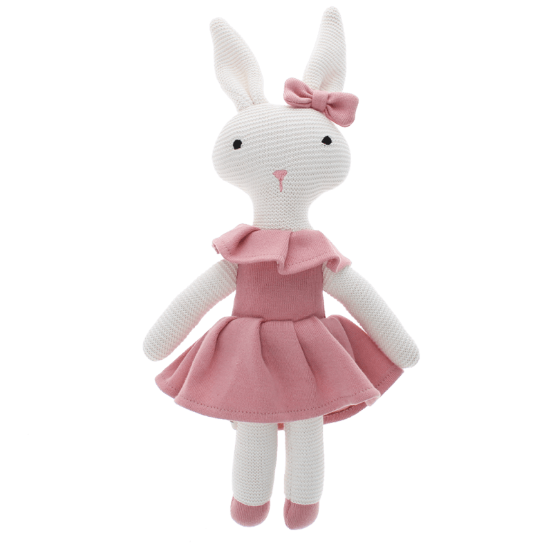 A wonderful first friend for little ones! This beautifully knitted bunny is made from soft cotton and features an embroidered face, a gorgeous pink bow and ruffled dress. Perfect for snuggles, storytime and imaginative play.
