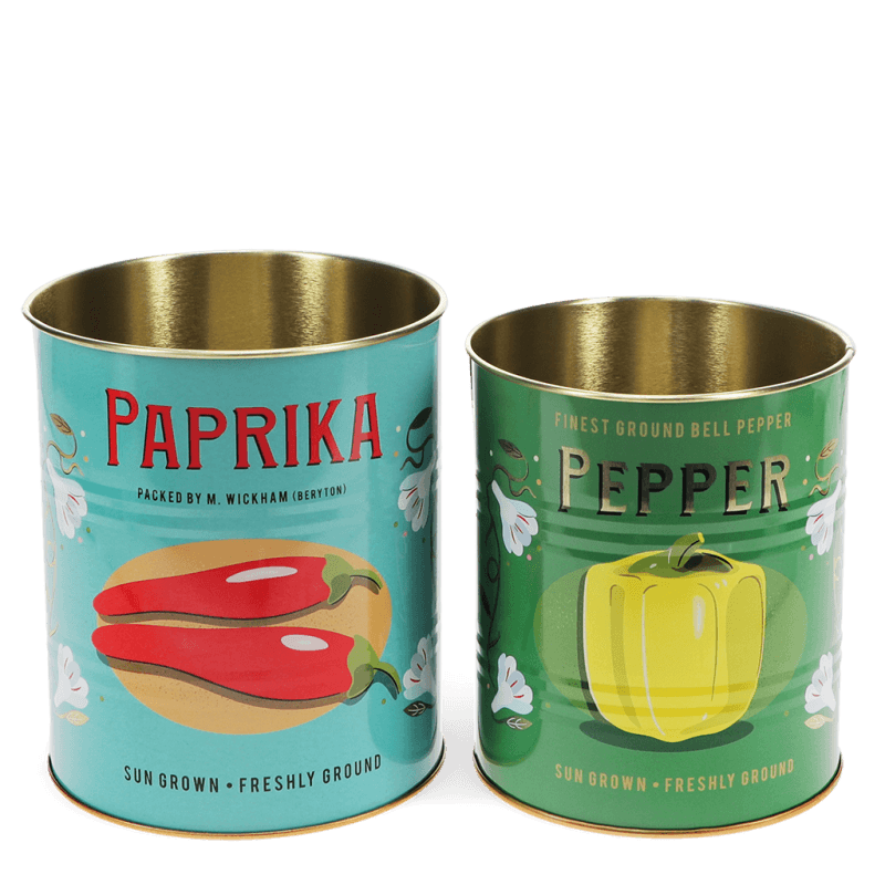 Pair of medium metal storage tins, featuring delightful retro style "Paprika" and "Pepper" prints, inspired by vintage canned food branding. Ideal for organising and displaying stationery, kitchen utensils, craft tools and more. Similar storage tins in other sizes are also available. Larger tin, with "Paprika" print, measures approx. 11cm (diameter) × 13cm (height) Smaller tin, with "Pepper" print, measures approx. 10cm (diameter) × 12cm (height)