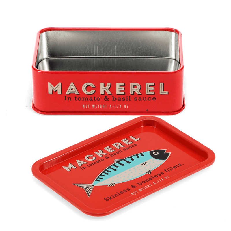 Mini metal rectangular storage tin featuring a delightful retro style "Mackerel" print on the lift-off lid and along the sides, inspired by vintage canned fish branding. A fun, decorative and practical storage solution, ideal for keeping trinkets, small items, stationery pieces, or crafting bits neatly tucked away. Measures approx. 9cm × 5cm × 2cm internally