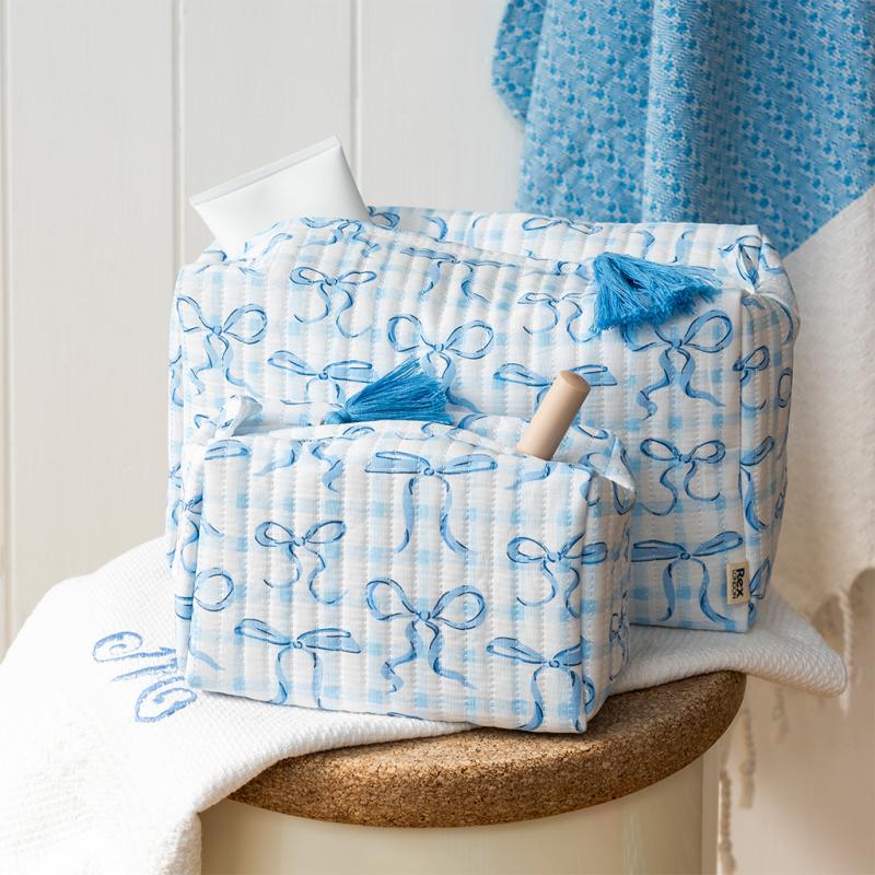 A soft quilted makeup bag in in white, with a faint blue gingham pattern, accented by a scattering of pretty blue bows. The perfect travel companion to organise and carry makeup and other cosmetics. Made from cotton with a quilted texture Features zip fastening with tassel detail in blue, water-resistant EVA interior lining and three internal pockets Matching wash bag is also available Wipe clean only