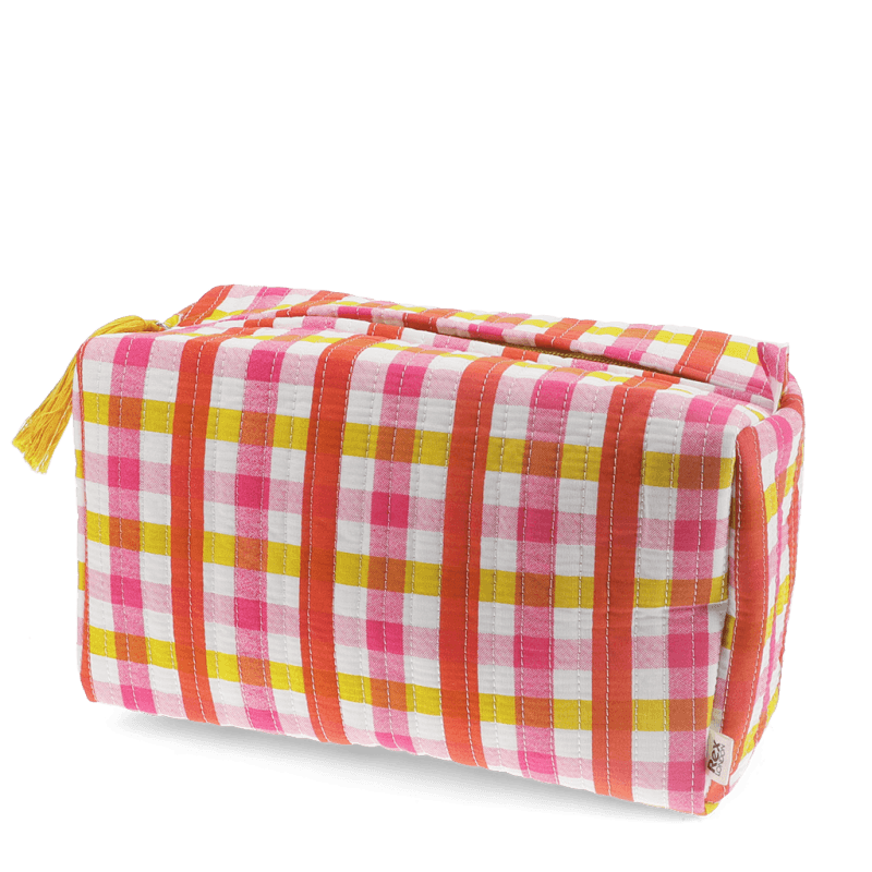 A soft, quilted wash bag, featuring a multi‑coloured gingham pattern combining shades of pink, yellow, red and white. The perfect travel companion to organise and carry toiletries and other essentials for holidays, weekend trips, etc. Made from cotton with a quilted texture Features zip fastening with tassel detail in yellow, water-resistant EVA interior lining and three internal pockets Matching makeup bag is also available Wipe clean only Packaging: Printed card swing tag, attached with string