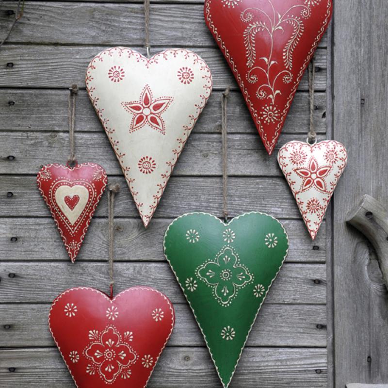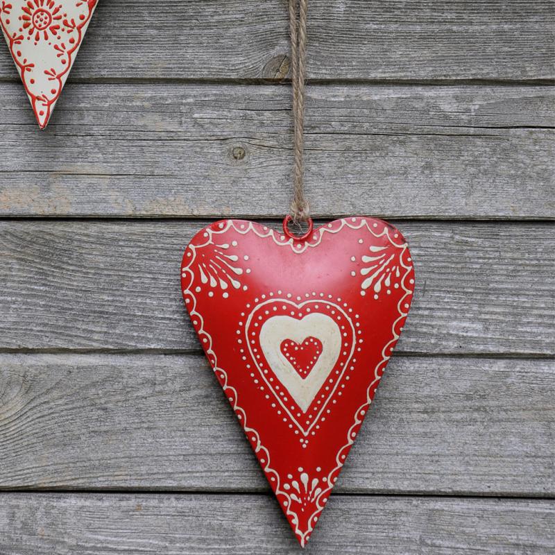 Small red rustic metal decorative hanging heart with hand painted cream love hearts design. Due to the hand painted nature of this item, there maybe imperfections or variation in design therefore each item is unique.