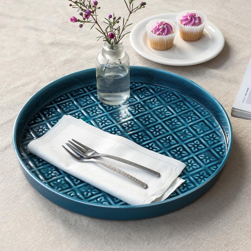 Decorative cast metal trinket tray with blue enamel finish. Circular in shape, with a beautiful pattern in the centre. The perfect accessory for home décor, that can be used to place a wide array of items: knick knacks, jewellery (rings, earrings, etc.), keys, loose change and more.